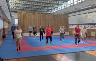 Już pierwszego dnia odbyły się zajęcia z Pilatesu z panią mgr Marzeną Wieczorek-Przybyło, doktorantką AWFiS, trenerką projektów Onco Move oraz OnkoSport. Zajęcia miały na celu – oprócz wzmocnienie mięśni głębokich i ogólnego poprawienia postawy – również poprawy świadomości swojego ciała.